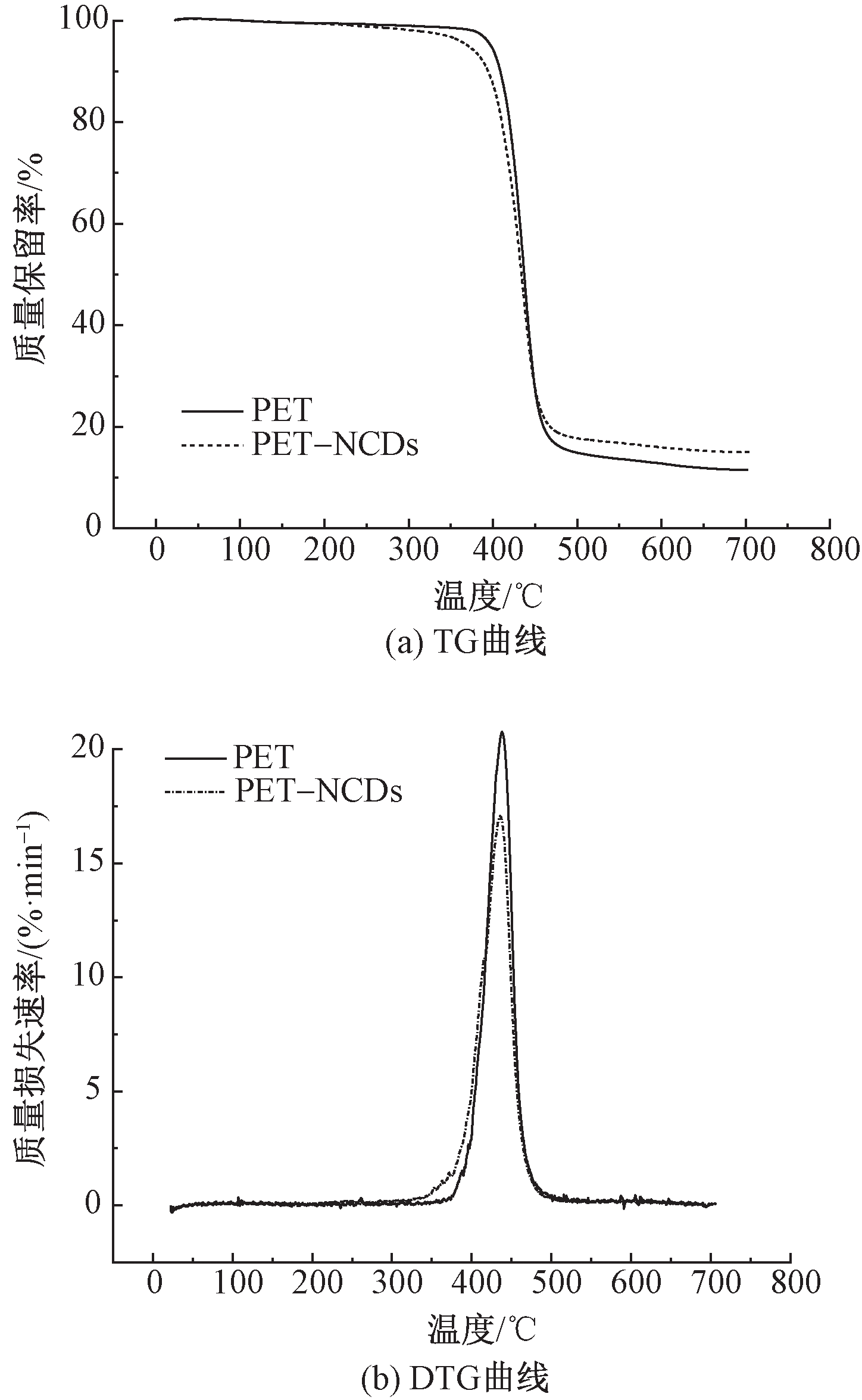 Thermogravimetric analysis curves of PET and PET-NCDs. (a) TG curves; (b) DTG curves"