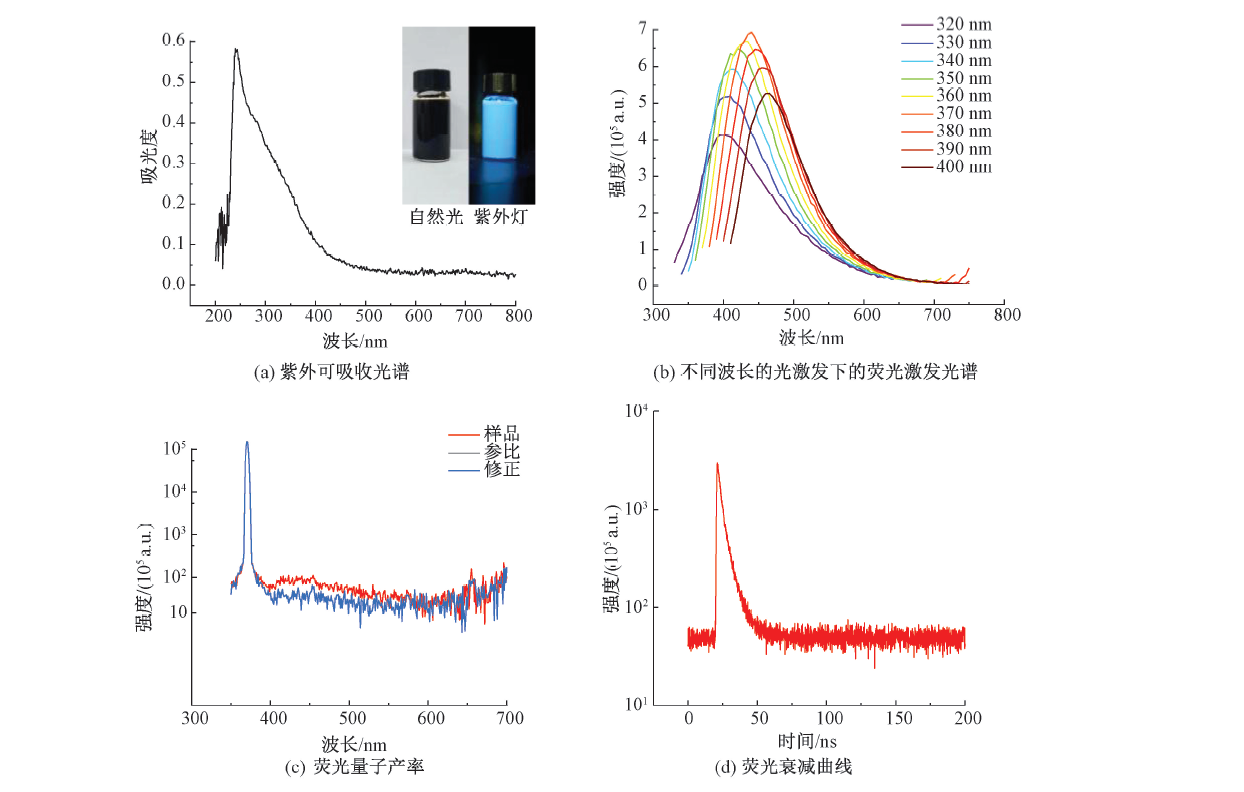 Results of topographic optical characteristics of NCDs. (a) UV-vis absorption spectrum; (b) Photoluminescence spectrum; (c) Absolute fluorescence quantum yield; (d) Fluorescence attenuation curve"