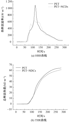 Conical calorimetric curve of PET with PET-NCDs. (a) HRR curve; (b) THR curve"