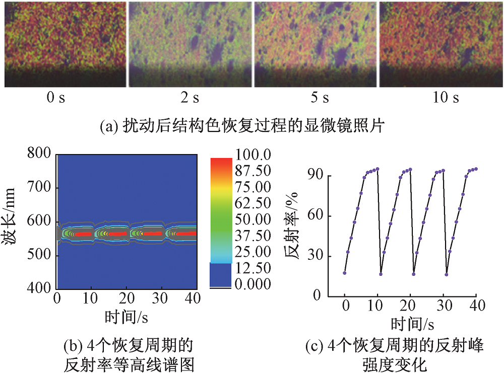 Dynamic recovery ability of structural color of LPCs. (a) Recovery process of structural color after disturbance; (b) Reflectance spectra of four recovery periods; (c)Intensity changes of reflection peaks during four recovery periods"