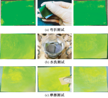 Structural stability test of structural colored fabric. (a) Bending test; (b) Washing test; (c) Rubbing test"