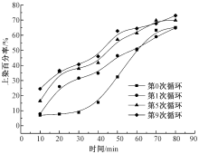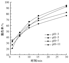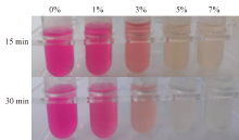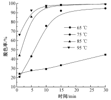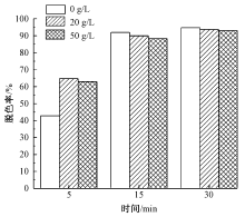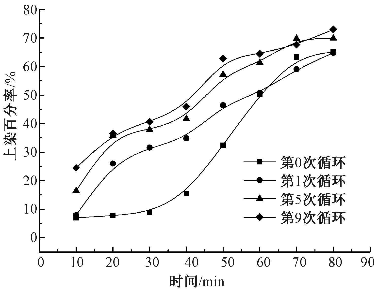Results The results showed that the decolorization rate of dye solution increased with the increase of temperature, and the higher the temperature the shorter the treatment time (Fig. 2). Under the same treatment time, the higher the treatment agent concentration, the higher the decolorization rate of dye solution, indicating that increasing the concentration of treatment agent was conducive to reducing the number of dye molecules in the waste liquid. In addition, it was found that the same effect could be achieved by prolonging the treatment time when the concentration of treatment agent was low (Fig. 3). When the treatment time was 5 min, the decolorization rate of dye solution with 20 g/L of NaCl was up to 64.7%, which was 21.9% higher than that of without NaCl. Further increasing NaCl concentration to 50 g/L had no significant effect on the decolorization rate of dye solution. Further extending the treatment time to 30 min, NaCl showed little effect on decolorization rate of dye solution (Fig. 6). After treatment at 85 ℃ for 15 min, the maximum absorption wavelength in the visible region disappeared, and the decolorization rate of the dye solution was as high as 99.1% (Fig. 7). When the reactive dye was dyed with recycled water, the dye percentage in the first 30 min was 9.0%-13.9% higher than that of the deionized water at the same time. Increasing the number of dyeing cycles did not change the overall trend of dyeing rate curve (Fig. 8). Compared with the color parameters of the fabric dyed by deionized water, the color of the fabric dyed by cycle was darker, the red and blue light were weakened (Tab. 1).
