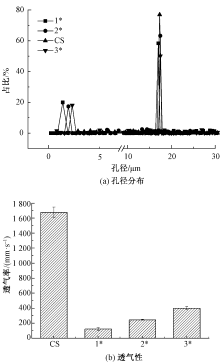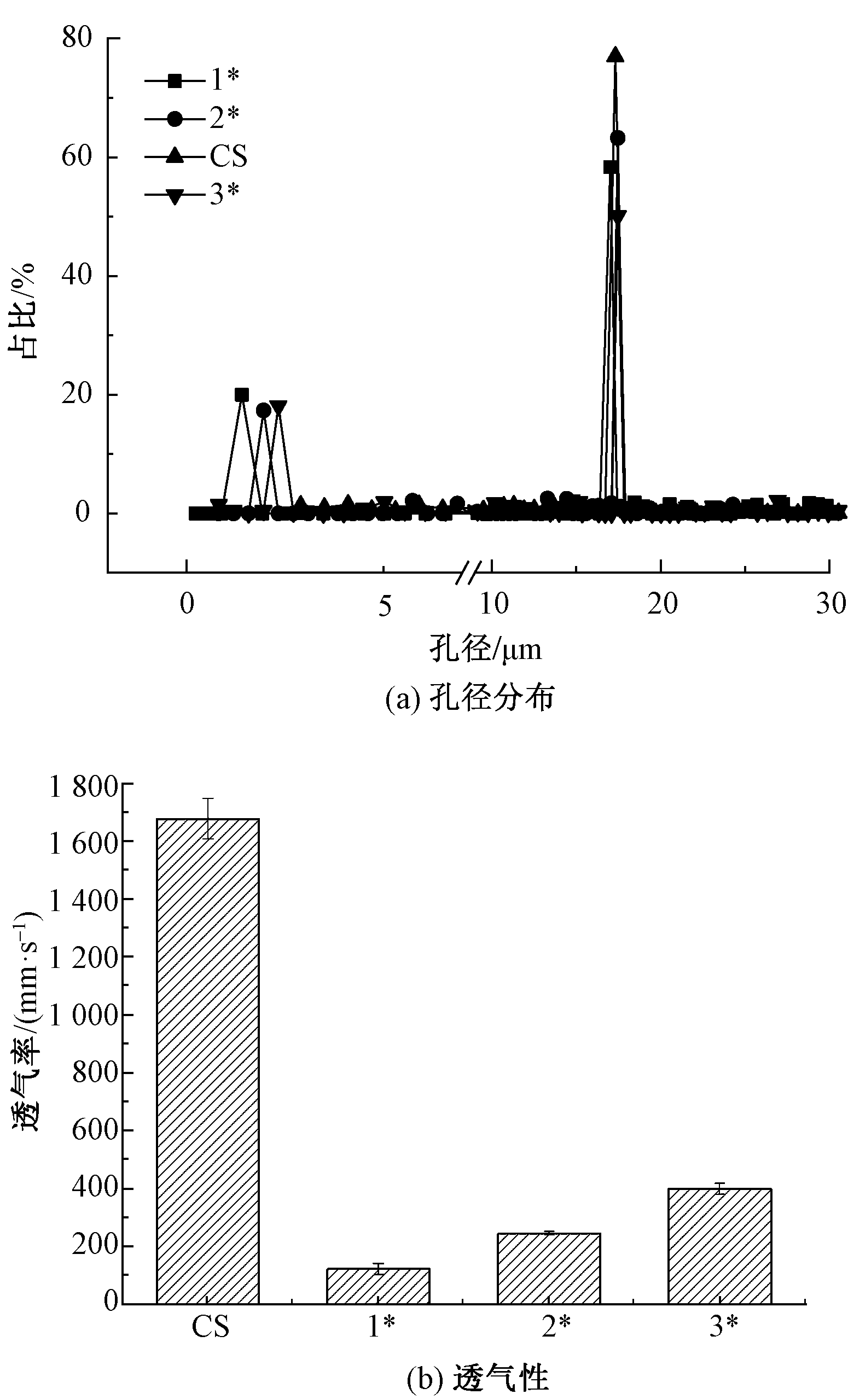 Pore size distribution and air permeability of CHI/PEO-CS with different PEO concentrations. (a) Pore size distribution; (b) Air permeability"