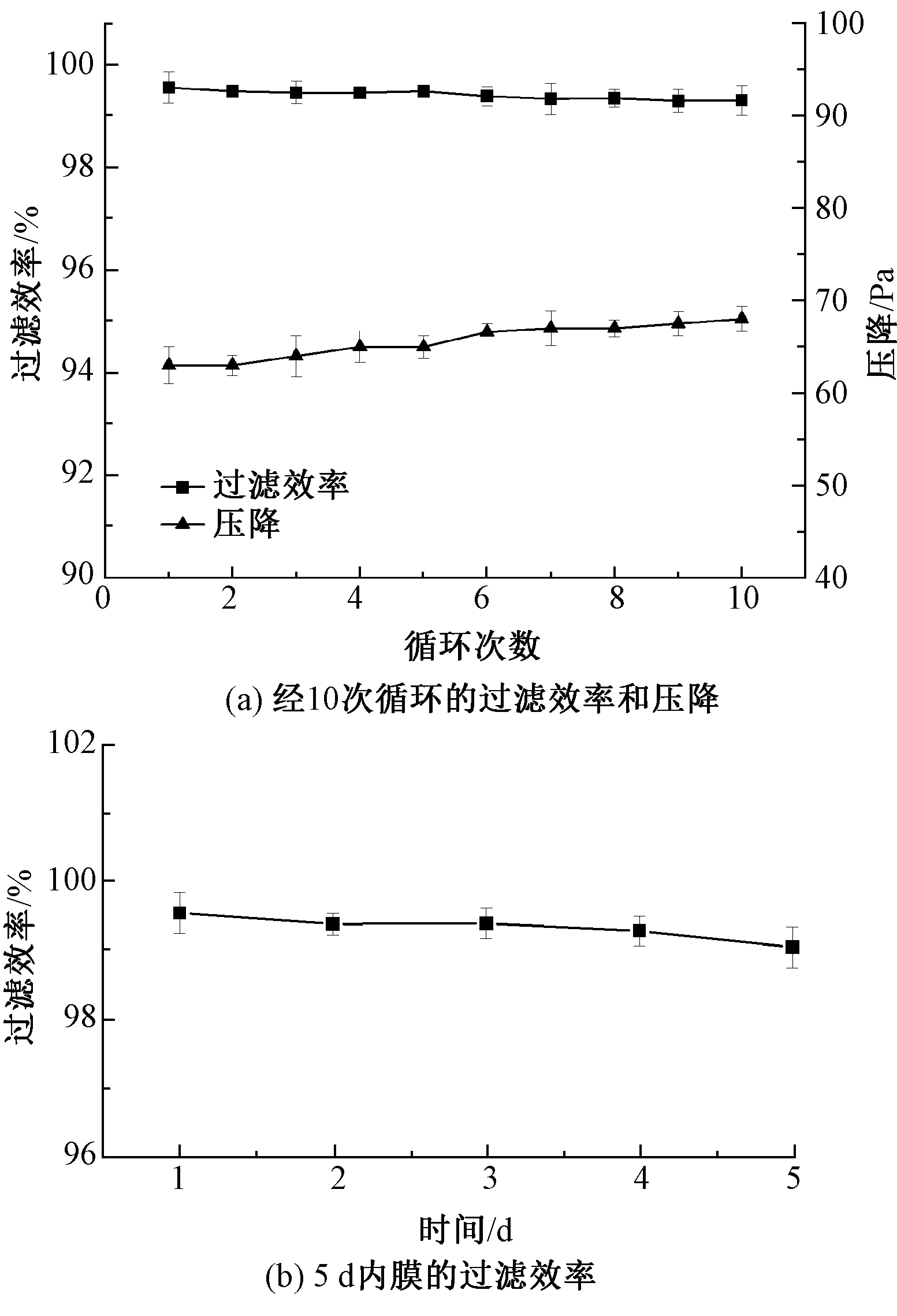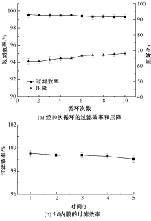 Stability of filtration performance of 2*. (a) Filtration efficiency and pressure drop of over 10 cycles; (b) Filtration efficiency of over 5 days"