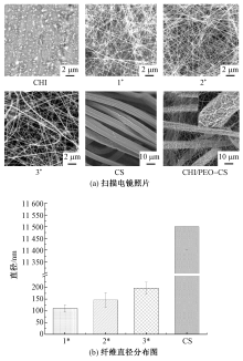 SEM images (a) and fiber diameter distribution map (b) of CHI/PEO-CS containing PEO with different concentrations"