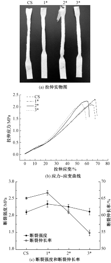 Mechanical properties of CHI/PEO-CS containing with different concentrations containing. (a) Tensile test photo; (b) Stress-strain curves; (c) Fracture strength and elongation at breaks"