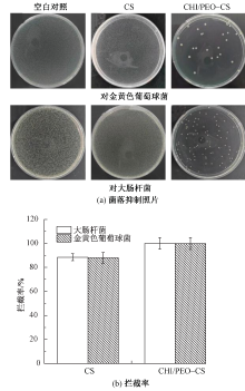Interception efficiency of basterial aerosols of CS and CHI/PEO-CS nanofiber membrane. (a) Aerosol colony inhibition photos; (b) Interception ratio"