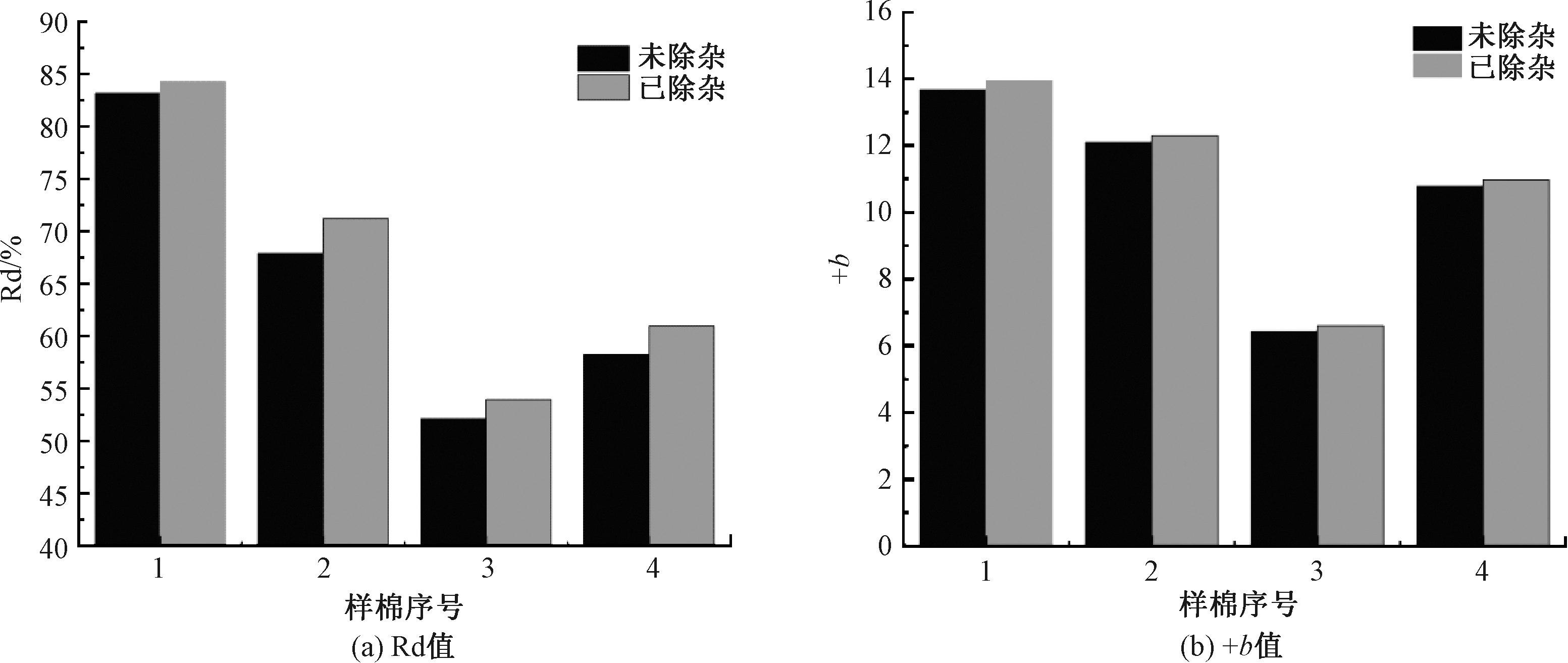 Results It is found that the Rd value and +b value detected in the cotton after impurity removal were higher than those detected before impurity removal, but the Rd value increased more and the +b value increased less. For the same cotton, the color value of cotton detected by image processing method was compared with the color value obtained by MCG-1 cotton detector, and the two results were highly correlated and linear, indicating that the results detected by the two methods were consistent. Cotton was continuously tested at different lengths of 0-72 h, and it was found that the test results were stable at each duration, and all were in the same area. Compared with the MCG-1 test results, they were all the same grade cotton. The results of the K-means algorithm were compared with the mean detection, and the results of the K-means algorithm were closer to the results obtained by the MCG-1 cotton detection instrument, and the detection accuracy was better than the results obtained by the mean detection.
