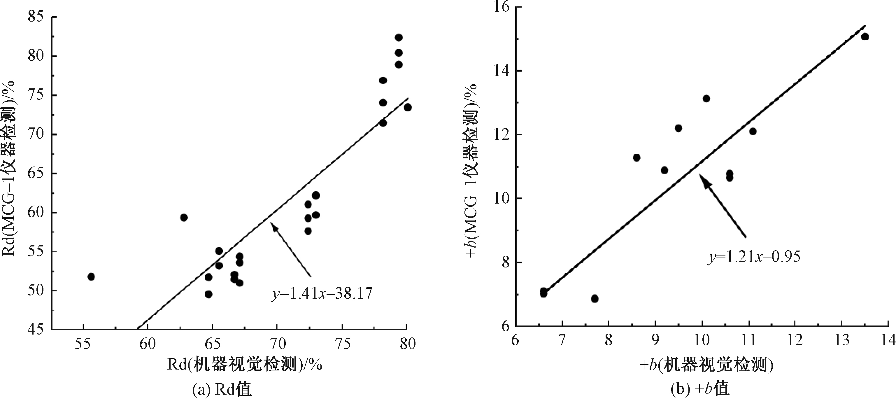 Comparison of Rd (a) and +b (b) values detected by image processing and MCG-1 instrument"