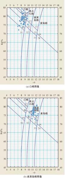 Scatter plots of color grades in sub-regions of two different cotton sample images. (a) White cotton image; (b) Light yellow dyed cotton image"