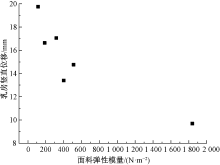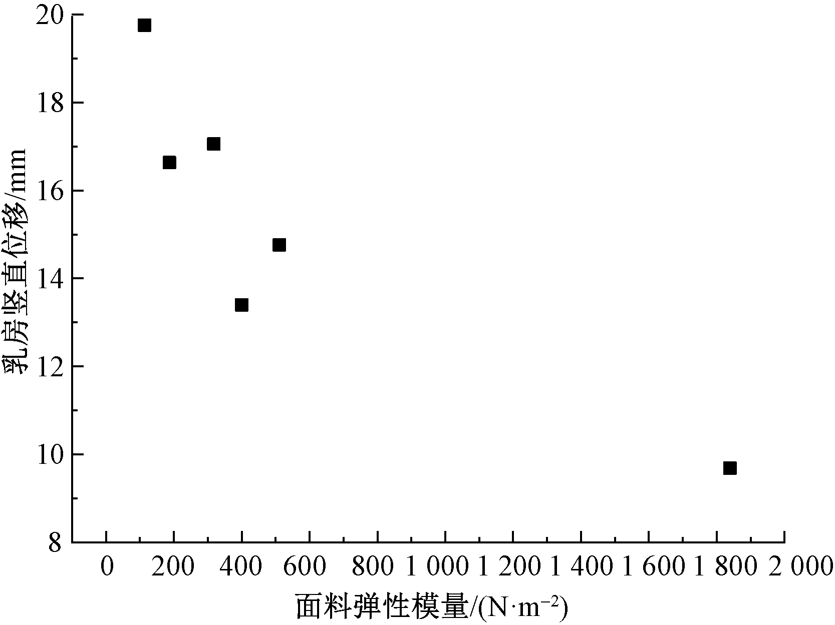 Scatter plot of fabric elasticity modulus and vertical breast displacement"