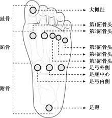 第4第5跖骨头中间、足弓外侧、足跟左、足跟右