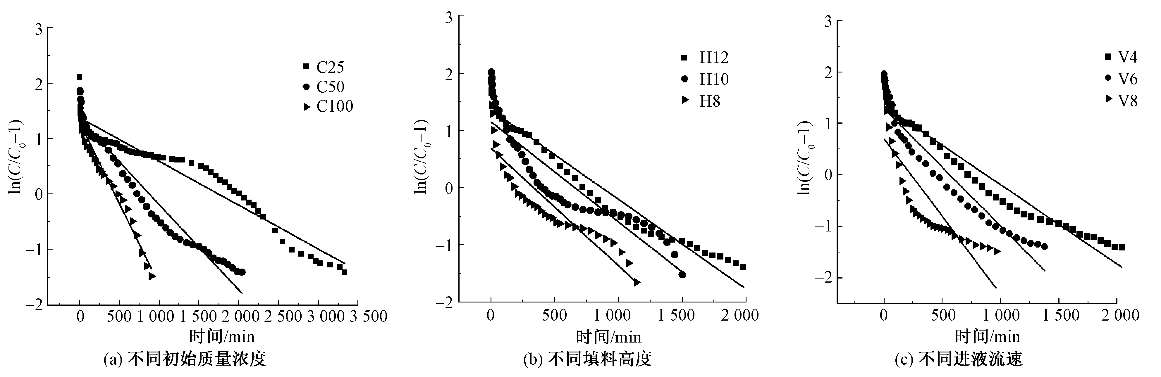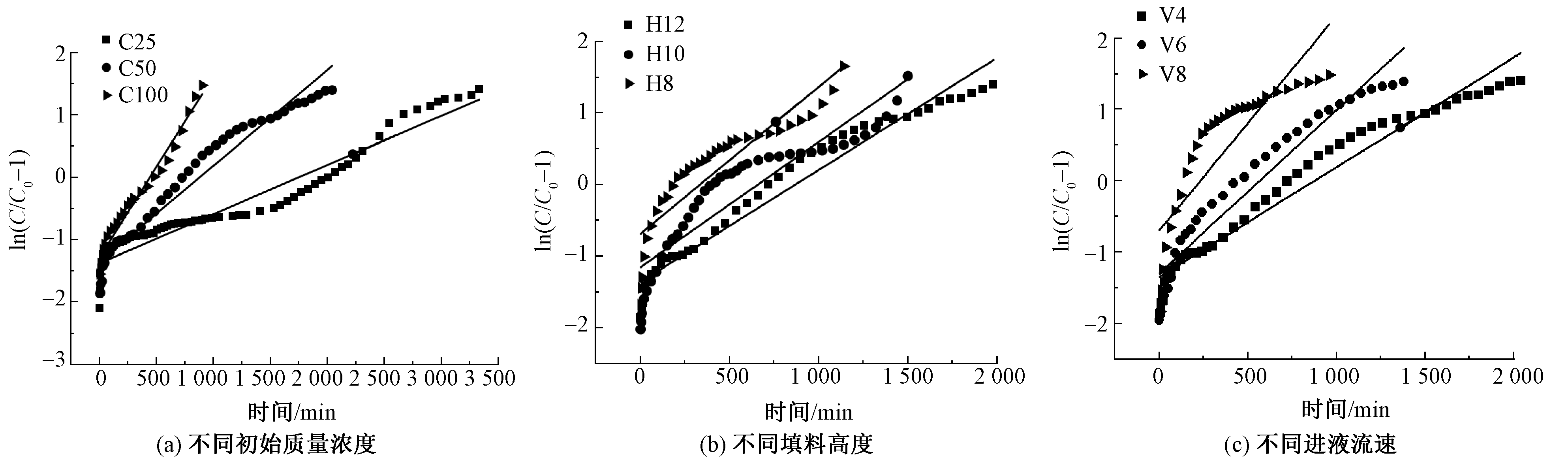 Fitting graphs with Thomas model under different conditions. (a) Different initial concentrations; (b) Different filling heights; (c) Different inlet speeds"
