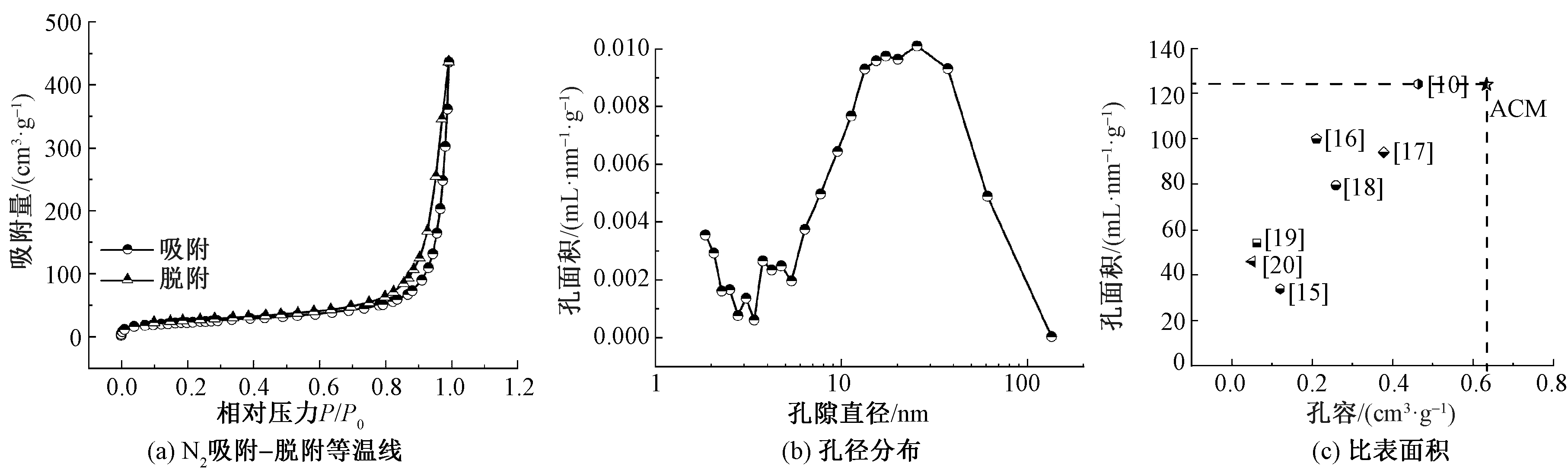 N2 adsorption-desorption isotherm of ACM (a),pore size distribution (b) and comparison of specific surface area with other documens (c)"