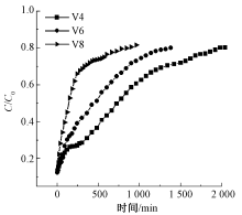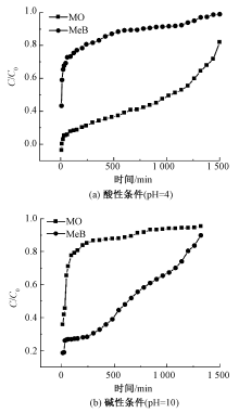 Breakthrough curves of hydrogel spheres against mixed dyes at different pH values. (a)Acidic condition (pH=4); (b)Alkaline condition (pH=10)"