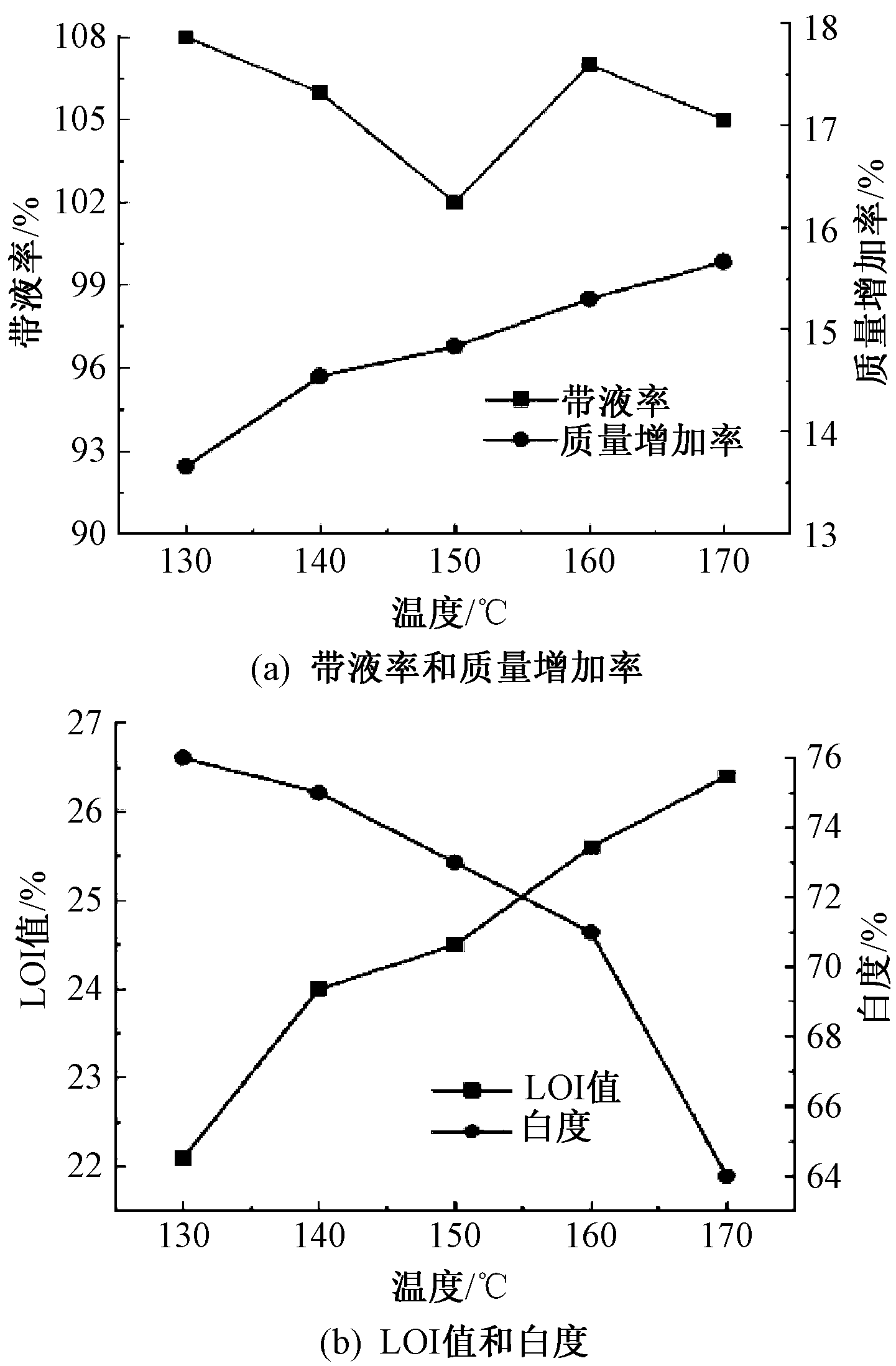 Effect of baking temperature on pickup and weight gain rate (a), LOI value and whiteness (b) of polyester/cotton blended fabric"