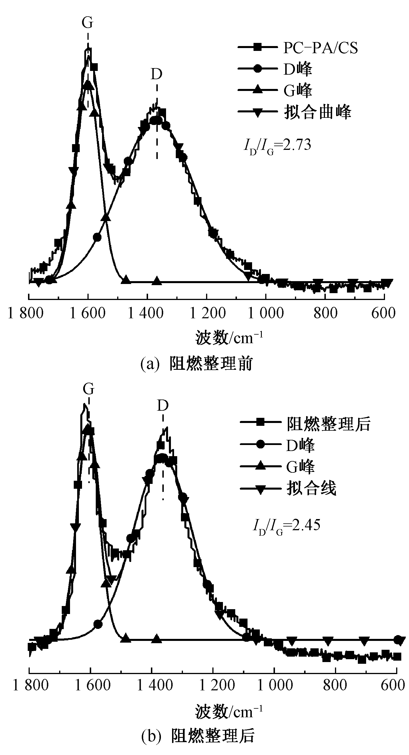 Raman spectra of char residue of polyester/cotton blended fabric after cone calorimetry testing. (a) Before flame retardant finishing; (b) After flame retardant finishing"