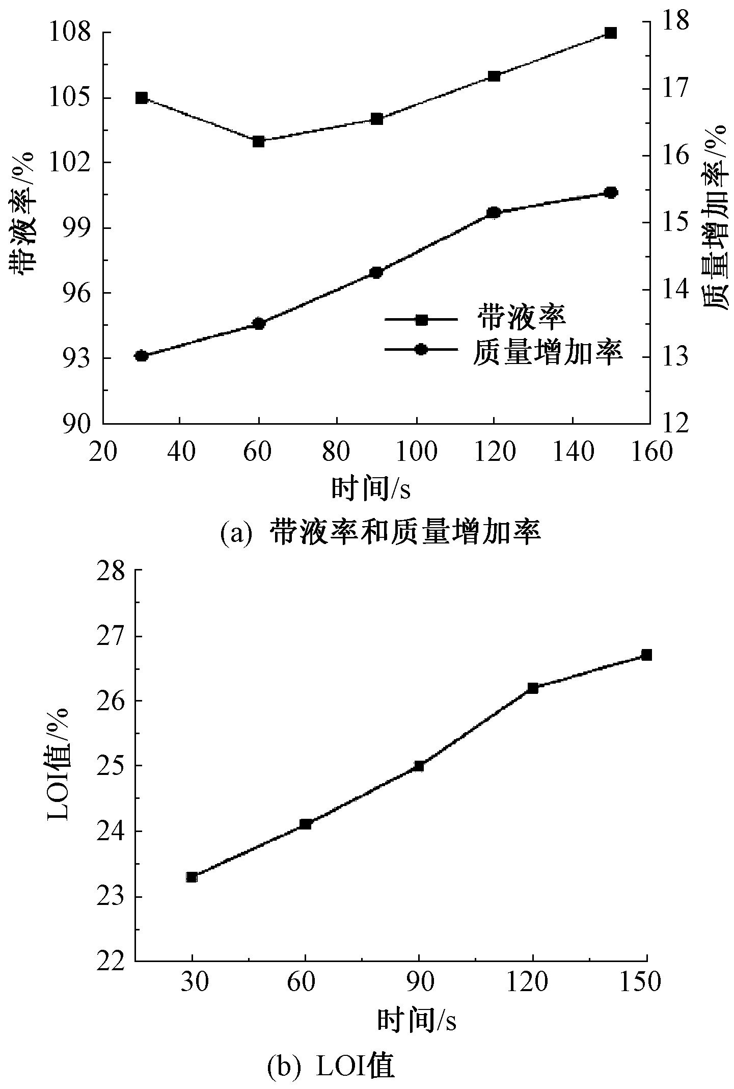 Effect of baking time on pickup and weight gain rate (a) and LOI value (b) of polyester/cotton blended fabric"