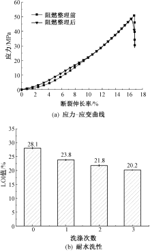 Stress-strain curves(a) and water resistance(b) of polyester/cotton fabric before and after flame retardant finishing"