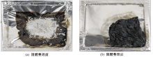 Digital photos of char residue of polyester/cotton fabric after cone calorimetry testing. (a) Before flame retardant finishing; (b) After flame retardant finishing"