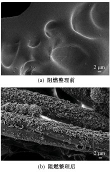 SEM images of char residue of polyester/cotton fabric after cone calorimetry testing. (a) Before flame retardant finishing; (b) After flame retardant finishing"