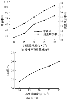 Effect of CS concentration on pickup and weight gain rate (a), LOI value (b) of polyester/cotton blended fabric"