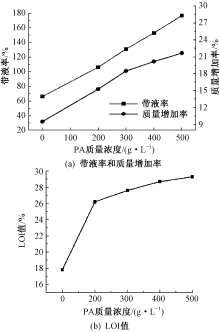 Effect of PA concentration on pickup and weight gain rate (a), LOI value (b) of polyester/cotton blended fabric"
