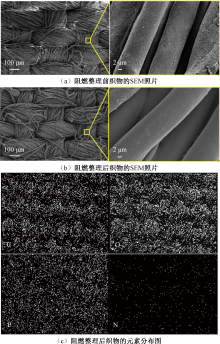 Microscopic morphology and elemental composition of polyester/cotton blended fabric. (a) SEM images of fabric before flame retardant finishing; (b) SEM images of fabric after flame retardant finishing; (c) Mapping of fabric after flame retardant finishing"