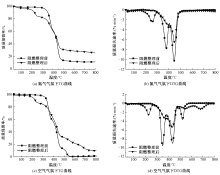 TG and DTG curves of polyester/cotton fabric in N2 or air atmosphere. (a) TG curves in N2; (b) DTG curves in N2; (c) TG curves in air; (d) DTG curves in air"