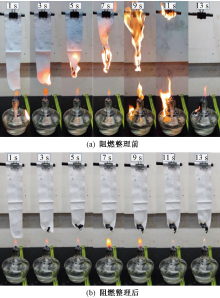Digital photographs of polyester/cotton fabric before(a) and after(b) flame retardant finishing continuously ingiting in air"