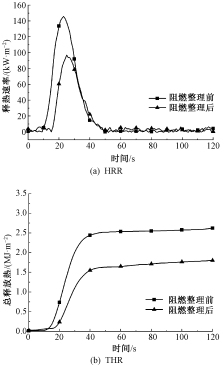 Data of cone calorimetric test of polyester/cotton fabric before and after flame retardant finishing"