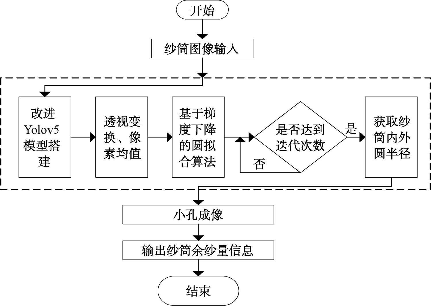 Method The improved Yolov5 model was adopted to detect the residual yarn quantity in a spindle, and the intercepted end picture of the spindle is extracted through perspective transformation, pixel average, contour detection and other operations to extract the inner and outer circle contours of the spindle. The circle fitting algorithm based on gradient descent designed in this paper was then adopted to fit the inner and outer circles of the spindle and obtain the inner and outer circle radii of the spindle. Finally, the principle of small-hole imaging was adopted to convert the pixel difference of the spindle into the actual residual yarn quantity.