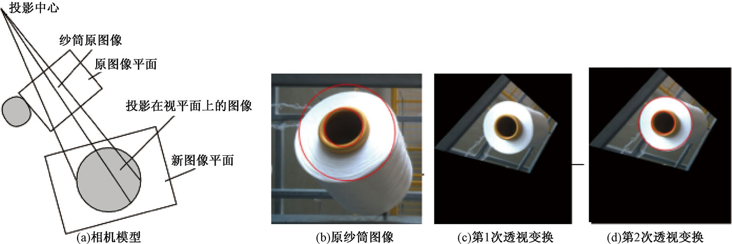 Perspective change process of spindle. (a) Camera model; (b) Image of original yarn tube; (c) Primary perspective change; (d) Secondary perspective change"