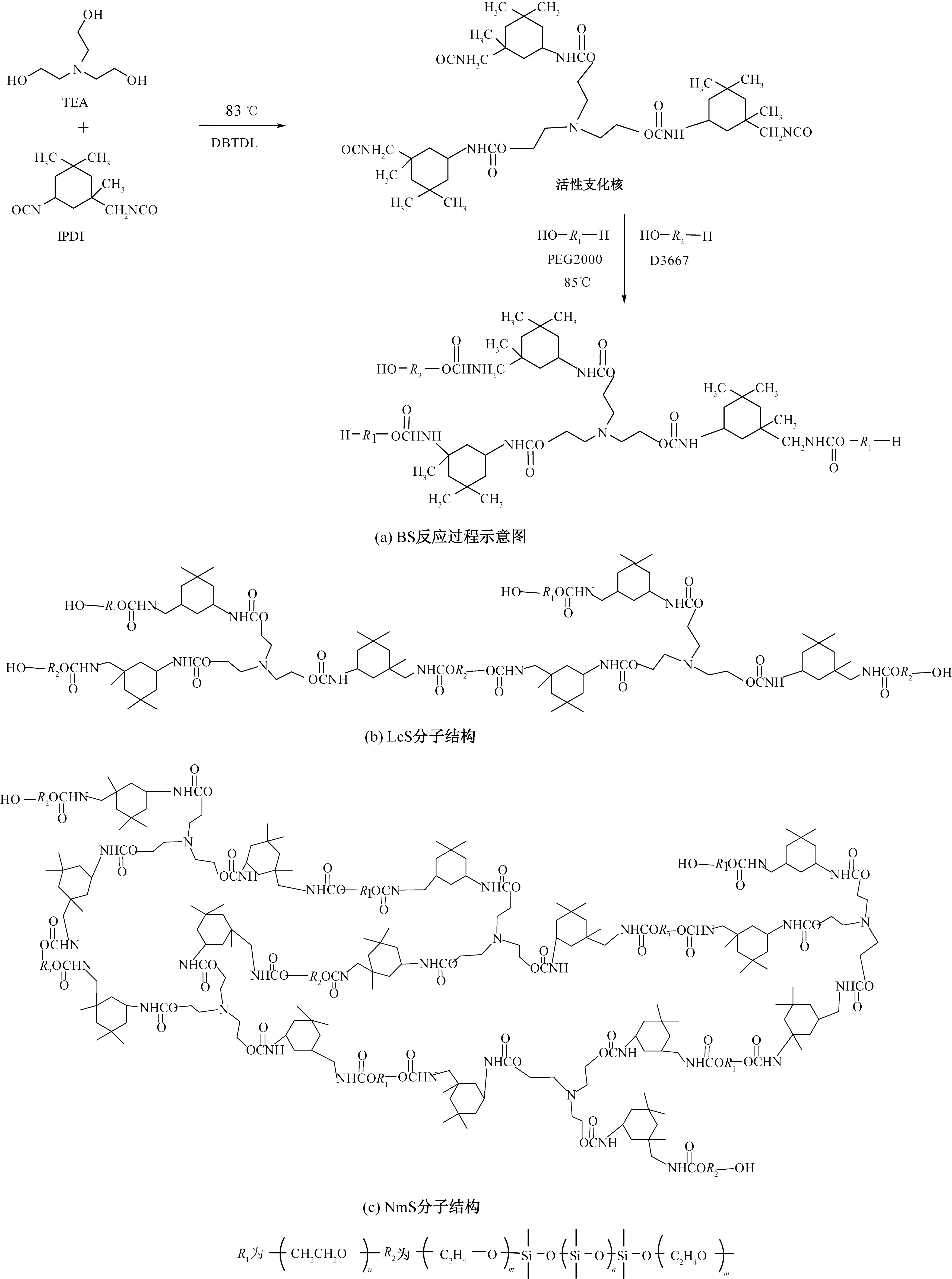 Method Triethanolamine and isophorone diisocyanate (IPDI) were adopted to prepare the prepolymer. The chain extension was carried out by introducing small molecule hydroxyalkyl silicone oil 3667(D3667) and polyethylene glycol 2000(PEG2000) into the prepolymer. A series of nonlinear cationic polyurethane modified silicone softeners (BS, LcS and NmS) were synthesized associated with different feeding ratios of IPDI, PEG2000 and D3667. The chemical structure of the products was characterized by Fourier transform infrared spectra. The thermodynamic properties and surface morphology were utilized to explore the blending state between nonlinear cationic polyurethane modified silicone softener and amino silicon oil. The crease recovery angle, hydrophilicity and comprehensive hand feel of the finished fabric were studied to reveal the influence of softener structure on the performance of textile.