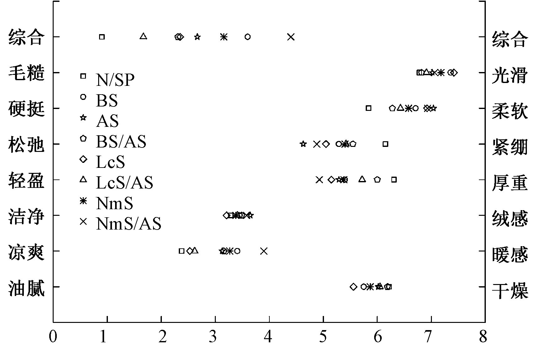Comparison of comprehensive hand feel of nylon/spandex before and after finishing"