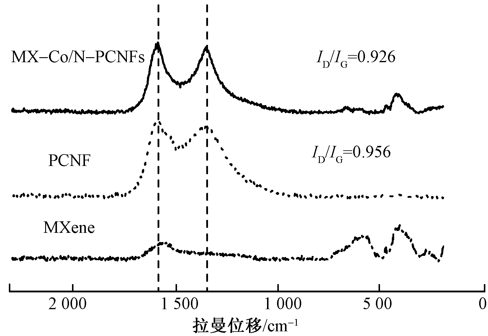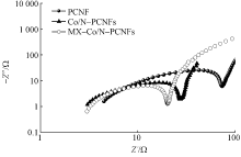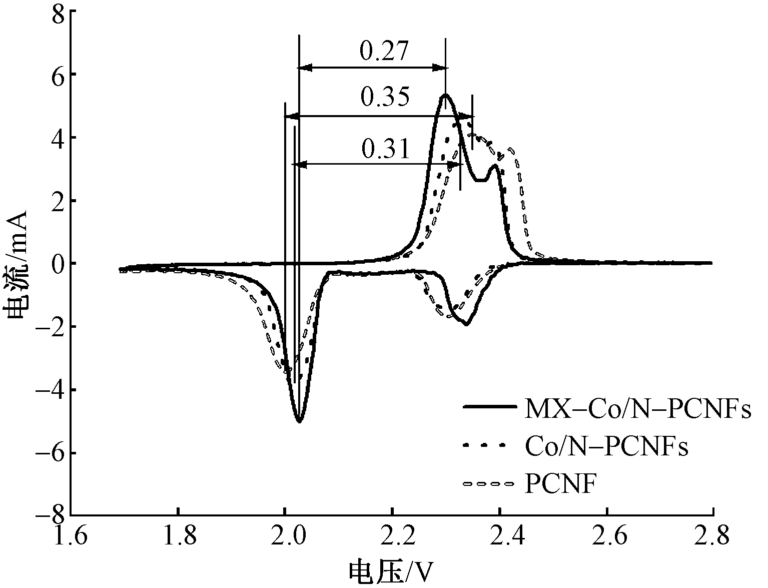 Results The morphology, structure, and impact of MXene addition on the adsorption of polysulfides and electrochemical performance were studied. After 180 degrees of twisting and bending, the surface of the sample showed no cracks and damage, and demonstrated excellent flexibility. The test results show that the total XPS spectrum analysis and peak fitting confirmed the introduction of MXene and the doping of cobalt nitrogen, and that the high degree of graphitization of the sample could be seen through the analysis of Raman spectrum. The specific surface area of MX-Co/N-PCNFs was 257.5 m2/g when the concentration of MXene dispersion was 90 mg/mL and the carbonization temperature was 800 ℃. The dynamic and static adsorption of sulfur proved that MX-Co/N-PCNFs intermediate layer achieved both physical and chemical adsorption to limit the shuttle effect of polysulfide, and also showed that it had the best catalytic activity. By testing the cyclic voltammetry curve (CV), the potential difference between the oxidation peak and the reduction peak of the MX-Co/N-PCNFs intermediate layer was 0.27 V respectively, which proved that it had a small polarization and a strong redox reaction kinetics. It is used as a polar plate and assembled into a symmetrical battery to characterize the liquid-liquid conversion process between liquid sulfur species. At a sweep speed of 50 mV/s, MX-Co/N-PCNFs based symmetric cells exhibit excellent REDOX current response among the three, indicating significant catalytic performance in liquid-liquid conversion processes. The electrochemical impedance spectroscopy results showed that the introduction of MXene nanosheets further promoted the conductivity and wettability of the middle layer of cobalt-nitrogen doped carbon nanofibers, resulting a very small interface impedance and charge transfer impedance. The battery assembled with MX-Co/N-PCNFs as the interlayer showed a capacity of 971.5 mA·h/g after 100 cycles at 0.2 C. The capacity decay was only 0.063% after 400 cycles at 1 C, and the capacity was still 853 mA·h/g after 50 cycles at 0.5 C with high sulfur loading (4 mg/cm2), which was better than that of the interlayer without the addition of MXene nanosheets.