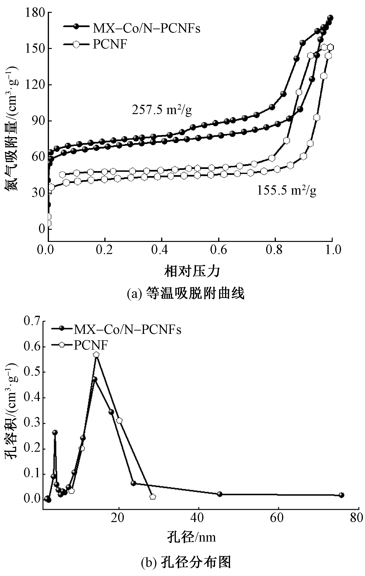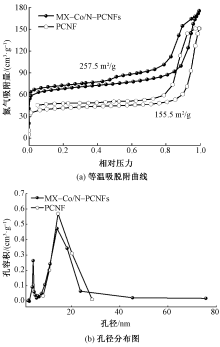 Specific surface area analysis of MX-Co/N-PCNFs (a) The isothermal adsorption-desorption curves; (b) Pore size distribution"