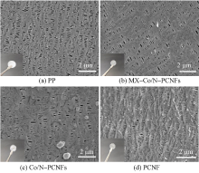 Morphology of three different interlayers. (a)PCNF; (b)Co/N-PCNFs; (c)MX-Co/N-PWFs; (d)Cross section of MX-Co/N-PCNFs"