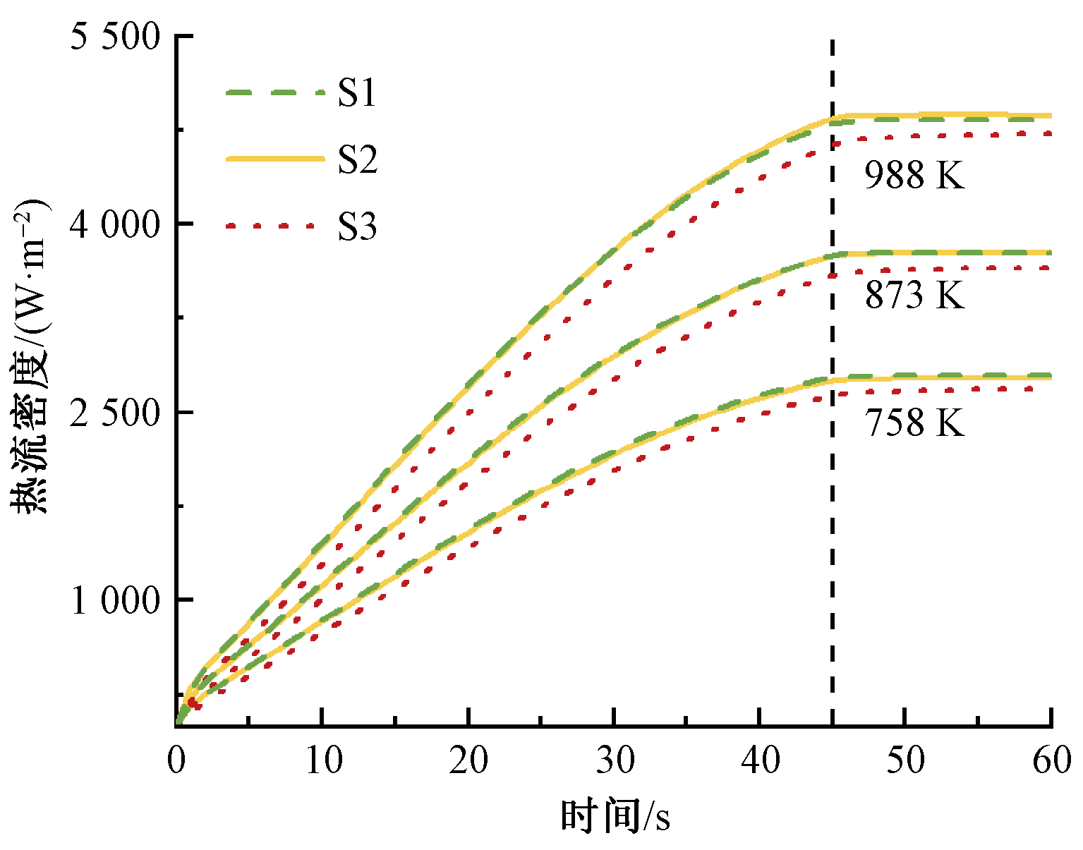 Heat flux histories of dermal layer for model S1, S2 and S3 under different peak temperature"