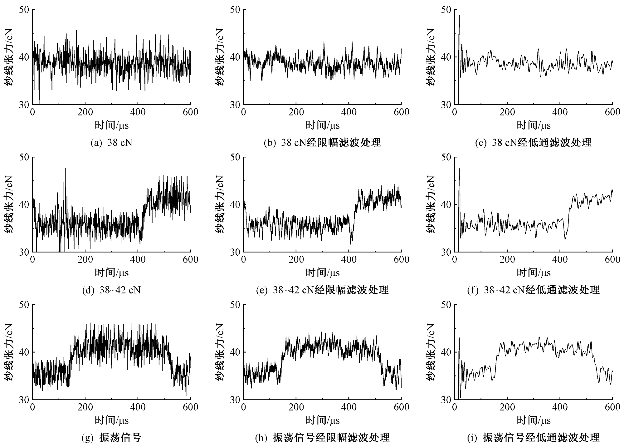 Tension signal preprocessing. (a) 38 cN; (b) 38 cN signal filtered with limiting filtering; (c) 38 cN signal with low-pass filtering; (d) 38-42 cN; (e) 38-42 cN signal filtered with limiting filtering; (f) 38-42 cN signal with low-pass filtering; (g) Vibrating signal; (h) Vibrating signal filtered with limiting filtering; (i) Vibrating signal with low-pass filtering"
