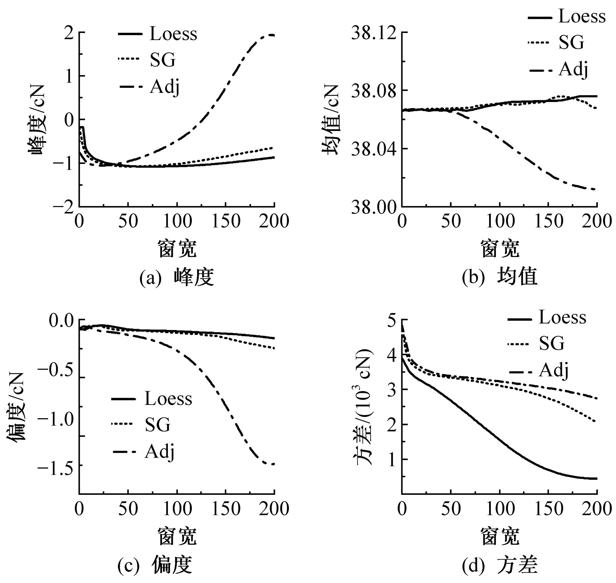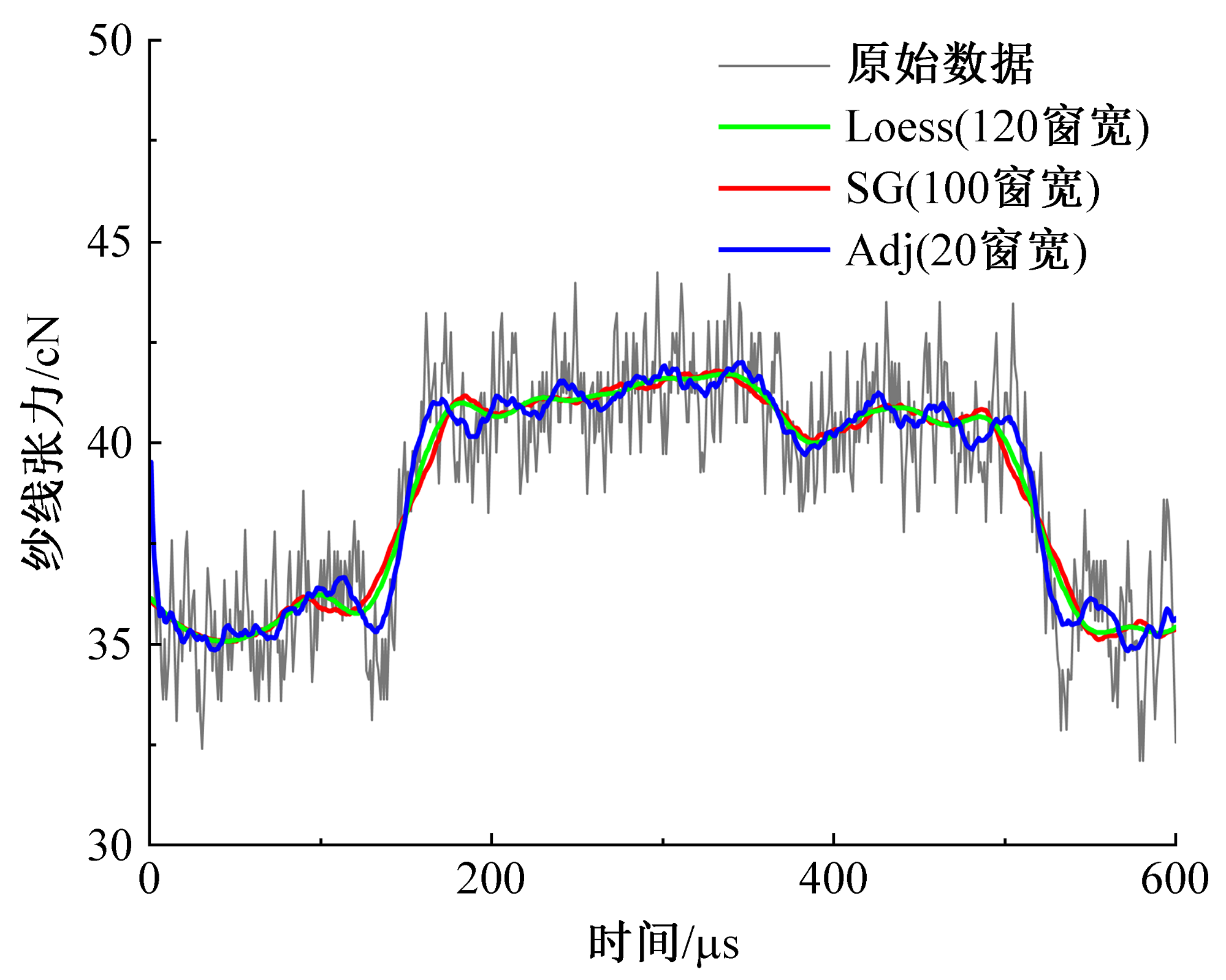 Results The method proposed in this article has achieved significant results in yarn tension measurement. The data was analyzed and the effectiveness of three different algorithms (SG, Adj, and Loess) was evaluated. The Loess algorithm was found most effective in achieving the smoothing of tension signals and the impact of response time. The effect of window width on tension signals was investigated experimentally, with a focus on the tension response time during signal processing. Window width appeared to be an important parameter in smoothing algorithms because it affects the trade-off between signal smoothness and response time. The response time of the loess algorithm increased with the increase of window width, and it was demonstrated that a wider window would lead to smoother signal, but with slower response to tension changes. By analyzing the inflection points, the optimal window width of the Loess algorithm was determined to be 120, where the signals achieved the highest smoothness while maintaining an acceptable response time.