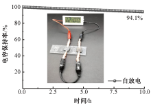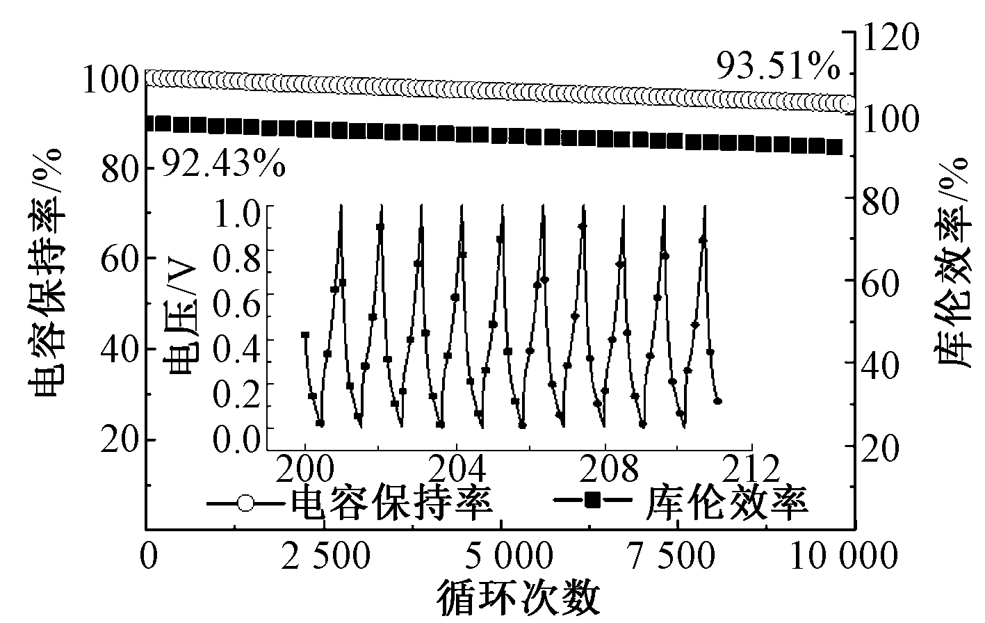 The supercapacitor exhibited a low resistance (Rs) of 6.74 Ω determined by the internal resistance of the electrode material and the electrolyte solution, and a charge transfer resistance (Rct) of about 8 Ω. The energy density of 47.99 μW·h/cm2 (25.04 μW·h/cm2) and power density of 0.5 mW/cm2 (10 mW/cm2) in this study is better than the same type of reports. After 10 000 cycles of charging and discharging, it was found to have a capacitance retention of 93.51% and a coulombic efficiency of 92.43%. There was no significant change in the energy storage performance after leaving the supercapacitor in the air for 30 days. When two 1 cm2 supercapacitor fabrics were connected in series, a small electric meter could be lit up. The capocitance retention was 94.1% after 10 h of placement, with good resistance to self-discharge.