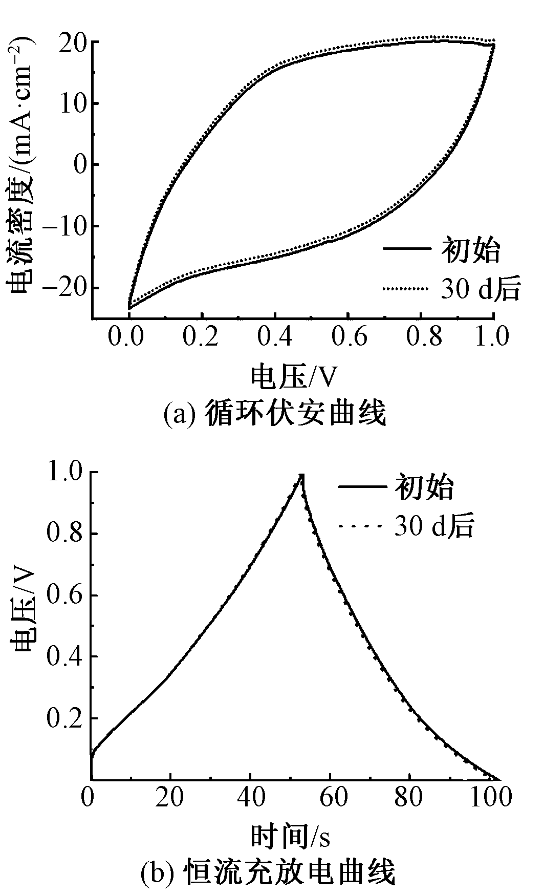 Energy storage performance of ZSC before and after 30 days in air. (a)Cyclic voltammetry curves; (b)Galvanostatic charge-discharge curves"