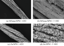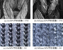 SEM images of flat-needle structure on surfaces of knitting fabrics. (a)Zn/SPN flat fabric(×370); (b)MXene/SPN flat fabric(×370); (c)Zn/SPN flat fabric(× 30); (d)MXene/SPN flat fabric(× 30)"