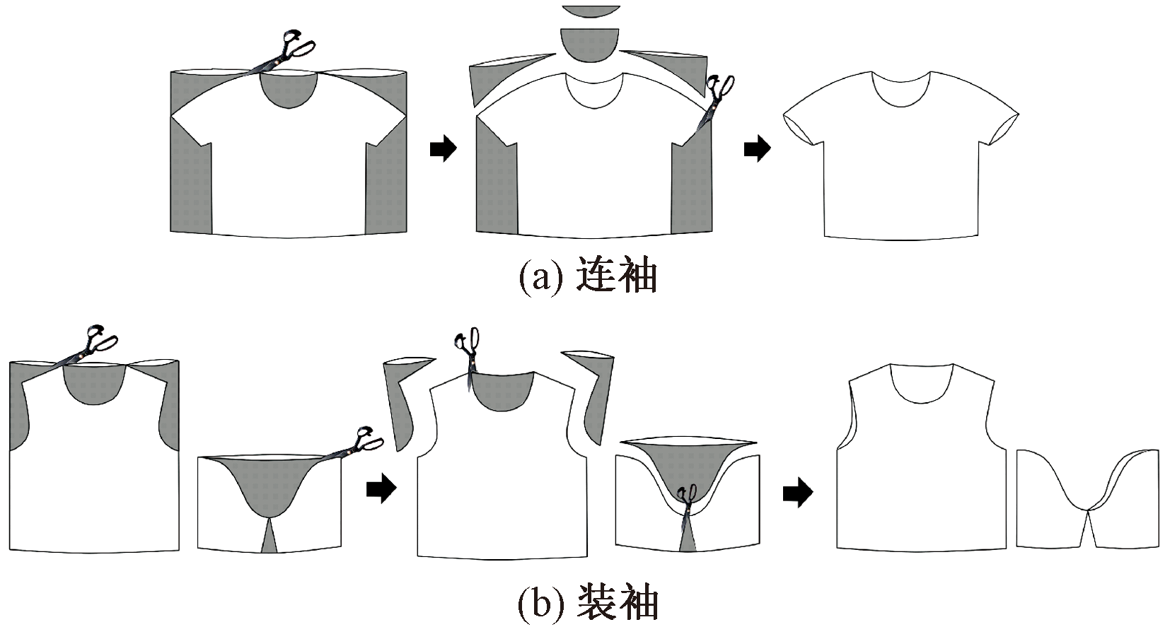 Plain T-shirt print. (a)Shoulder with sleeve; (b)Set-in sleeve"