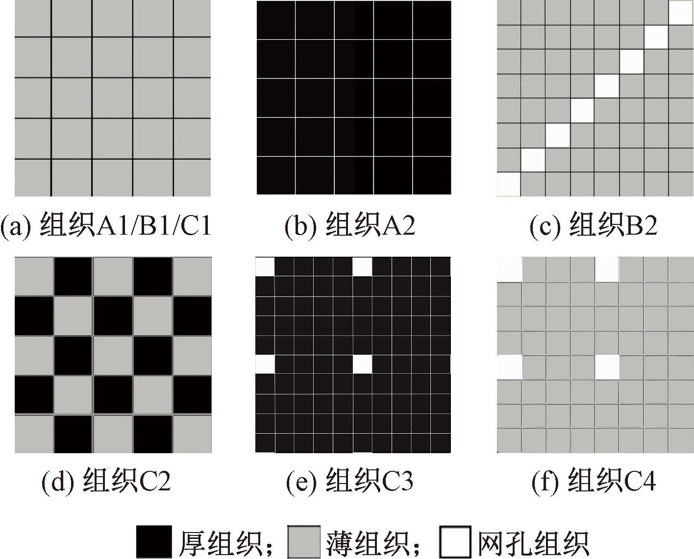 Design map of pattern in each region. (a) Pattern A1/B1/C1; (b) Pattern A2; (c) Pattern B2; (d) Pattern C2; (e) Pattern C3; (f) Pattern C4"