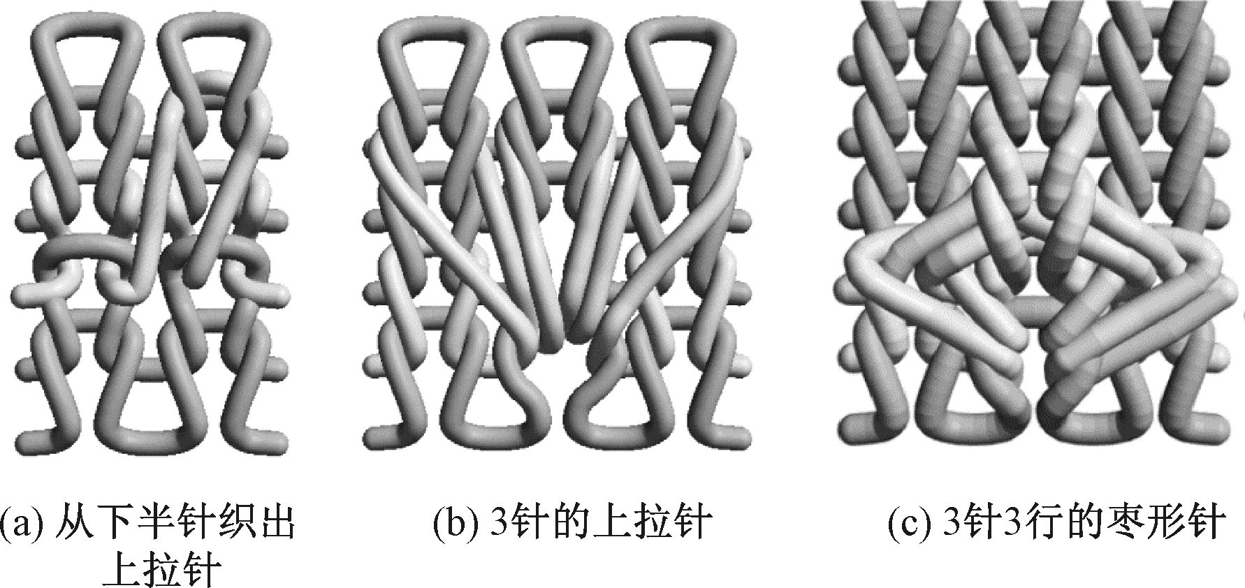 Examples of basic stitch derivation. (a) Pull-up stitches from below stitches; (b) Three pull-up stitches; (c) Jujube shaped stitches on three stitches and three rows"