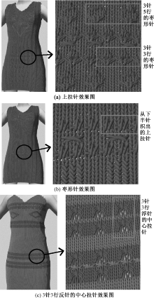 Stitch design effect drawings of dress. (a) Effect drawing of pull-up stitches; (b) Effect drawing of jujube shaped stitches; (c) 3 stitches and 3 rows of backstitch center pull stitches"