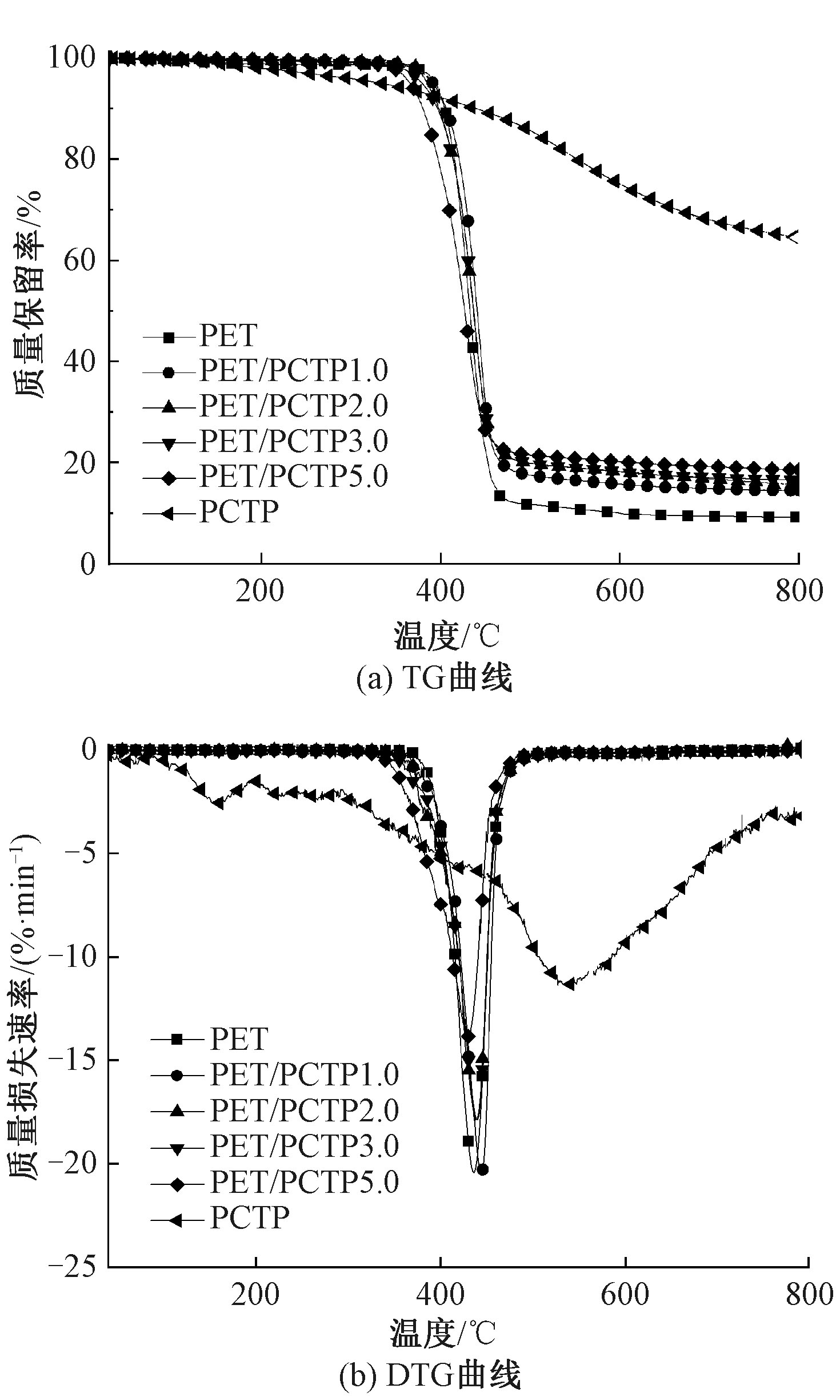 TG (a) and DTG (b) curves of PET and PET/PCTP composites in N2 atmosphere"