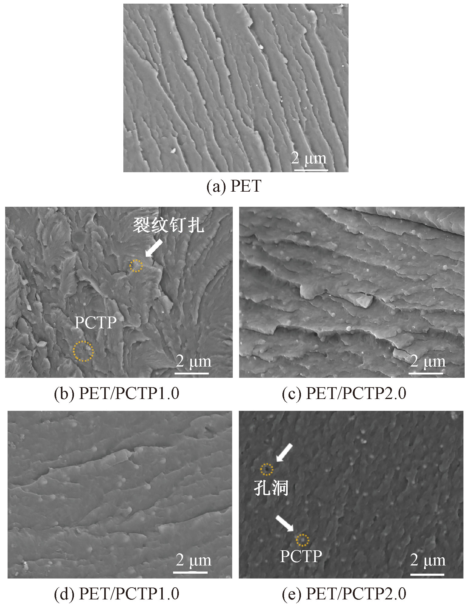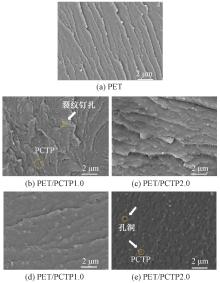 SEM images of fractured surfaces of PET and PET/PCTP composites"